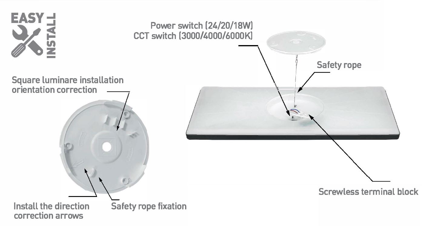 | Výhodné vlastnosti | Pomocí přepínače uvnitř svítidla lze přepínat příkon svítidla a přepínat teplotu světla CCT teplá 3000K, neutrální 4000K, denní 6000K. |