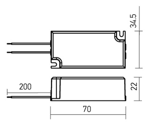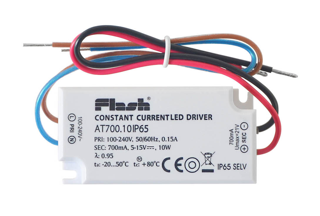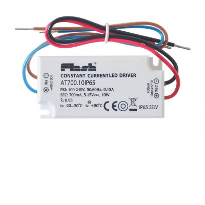 Napájecí zdroj konstatního proudu pro LED 10W/350mA, 10W/500mA, 10W/700mA, 230V, IP65, rozměry: 70x22x34,5mm.