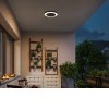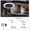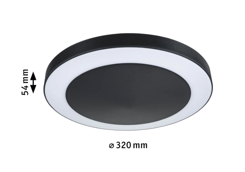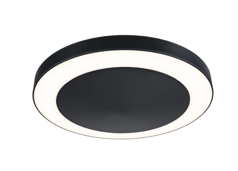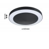 Stropní venkovní svítidlo, PIR senzor pohybu, záběr 120°, dosah 4m, těleso nerez, povrch černá antracit, dif plast opál, LED 14W, 880lm, teplá 3000K, 230V, IP44, tř.1, rozměry d=320mm, h=54mm.