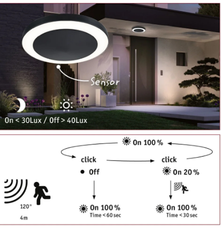 | Výhodné vlastnosti | PIR senzor pohybu se záběrem 120° a dosahem 4m. Světlo se automaticky rozsvítí ve tmě díky integrovanému soumrakovému senzoru. Když se někdo přiblíží, vnější světlo se přepne na 100% jas a po 30 sekundách se přepne zpět na 20% jas. |