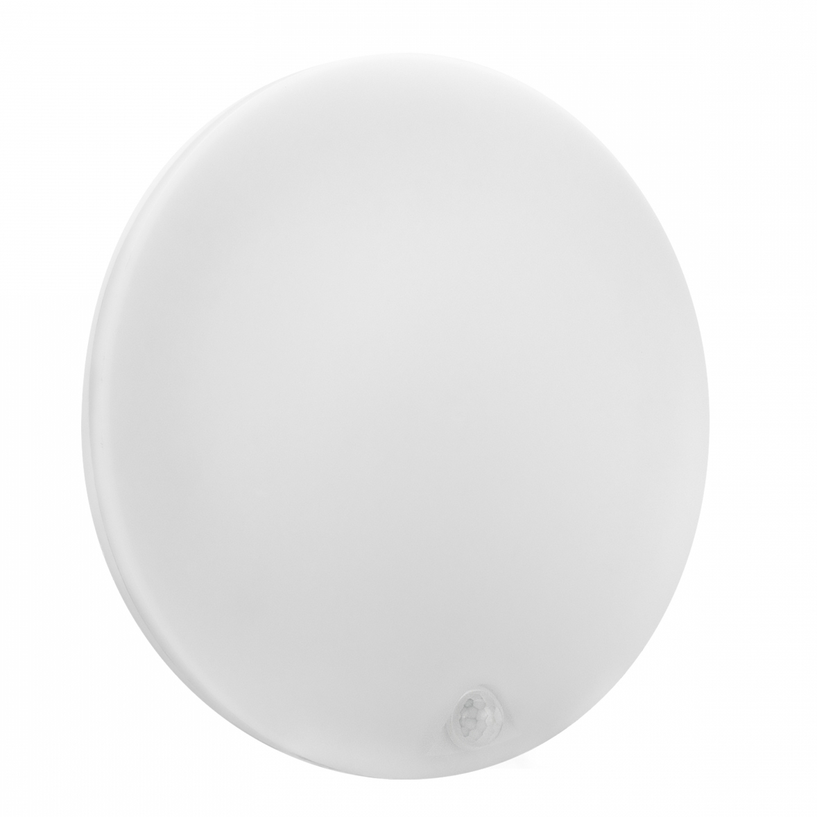Venkovní přisazené svítidlo, PIR senzor pohybu záběr 120°, soumrak 25lx, čas 20-90s základna kov, bílá, difuzor plast opál, LED 18W, 1800lm, teplá 3000K/neutrální 4000K, Ra80, 230V, IP54, rozměry d=300mm, h=60mm