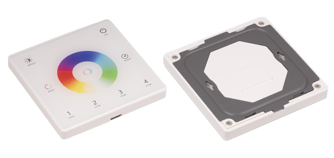 RF bezdrátový nástěnný dálkový ovladač pro řízení RGBW-CCT LED pásků dosah až 30m, 4 nezávislé zóny, napájení baterie CR2032 3V, rozměry 84x84x910mm