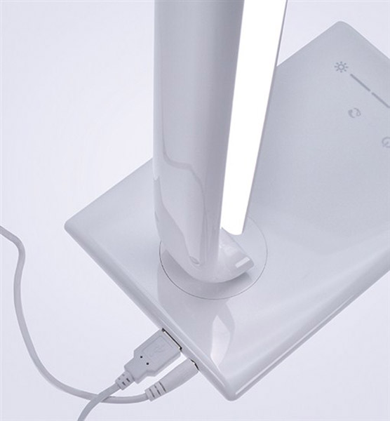 Stolní lampa, materiál plast, povrch černá, nebo bílá, LED 12W, 700lm, 5 stupňů CCT nast teploty světla teplá 3000K, neutr 4000K, denní 6000K, dotyk stmívač, 230V, IP20, tř.1, vč USB nap pro telefon