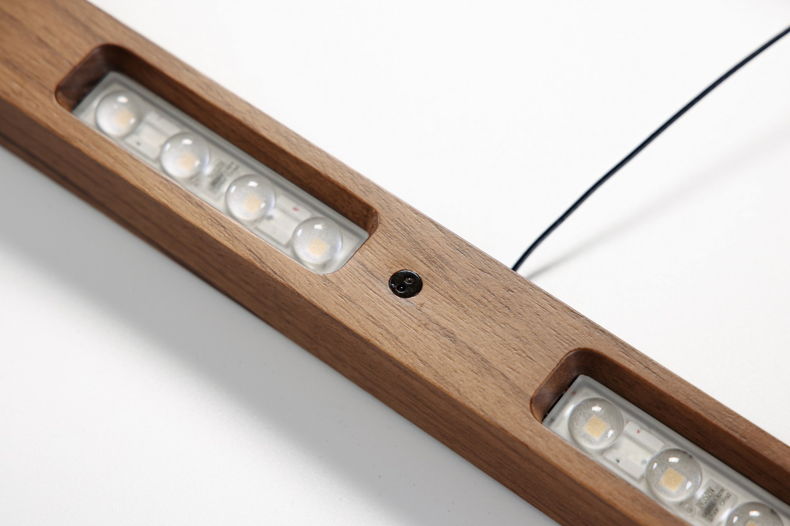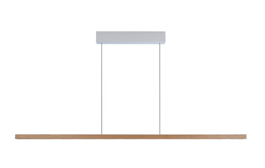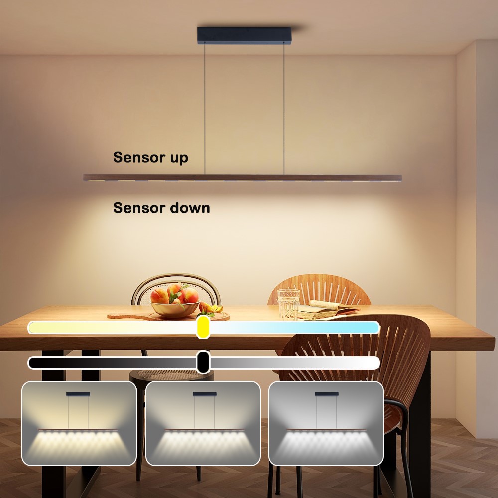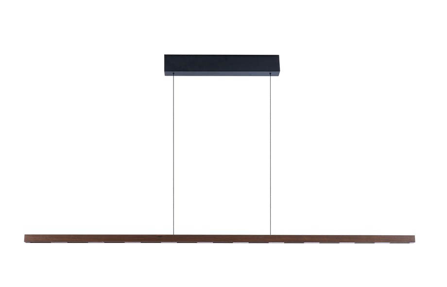 Závěsné svítidlo, ovládání senzorem, kov, povrch černá/bílá a dřevo tmavé/světlé, LED 37W, 5470lm, teplá 3000K, stmívatelné, Ra90, 230V, IP20, rozměry 1570x33×31mm, vč. záv. lanka l=1500mm, lze zkr, svítí nahoru/dolů.