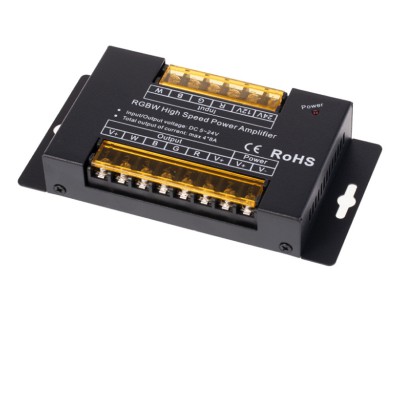 LED RGBW zesilovač 4x8A - Čtyřkanálový opakovač, zesilovač signálu, pro LED RGBW pásky, napájení 5V-24V, zátěž 4x8A =384W/12V, 768W/24V, rozměry 148x75x24mm.