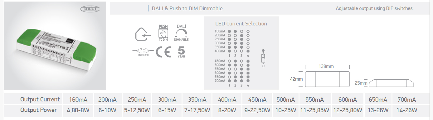 | Pomocí DIP přepínačů nasavitelný. výstupní proud | 160mA: 4,8-8W, 200mA: 6-10W, 250mA: 5-12,5W, 300mA: 6-15W, 350mA: 7-17,5W, 400mA: 8-20W, 450mA: 9-22,5W, 500mA: 10-25W, 550mA: 11-25,85W, 600mA: 12-25,80W, 650mA: 13-26W, 700mA:14-26W |