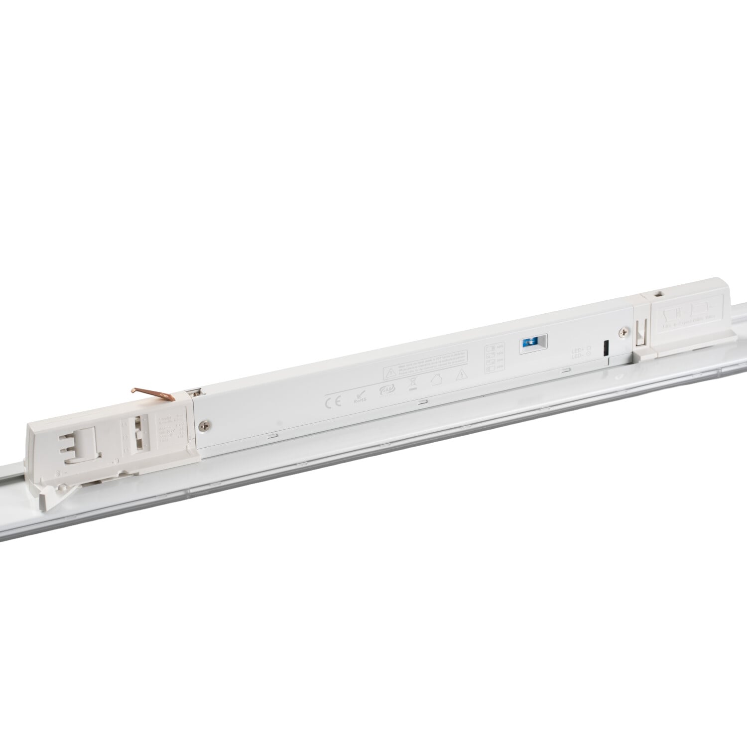 LED 60W/55W/50W/45W, CCT 3000K/4000K/5000K, 90° - Kolejnicové svítidlo, plast bílá, LED, přep příkon 60W/55W/50W/45W, 10000lm, přepín CCT teplá 3000K/neutrální 4000K/denní 5000K,vyzař úh 90°, Ra80, 230V, IP20, rozměry 1500x60x56mm, do 3F lišty