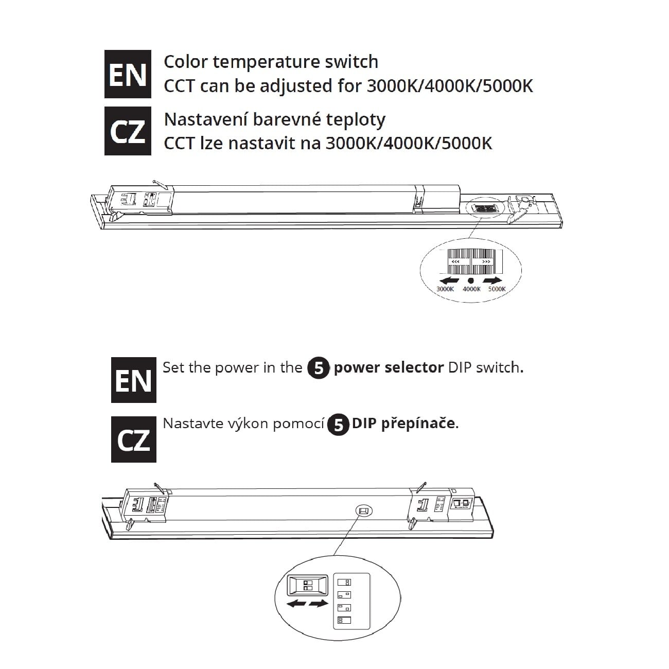| Výhodné vlastnosti | Svítidlo je vybaveno přepínačem příkonu v rozsahu 60W/55W/50W/45W, přepínatelná teplota CCT teplá 3000K/neutrální 4000K/denní 5000K, vyzařovací úhel 90° |
