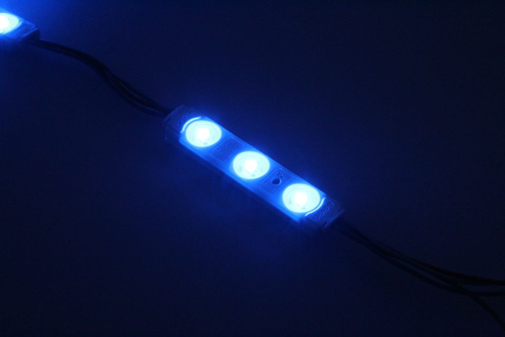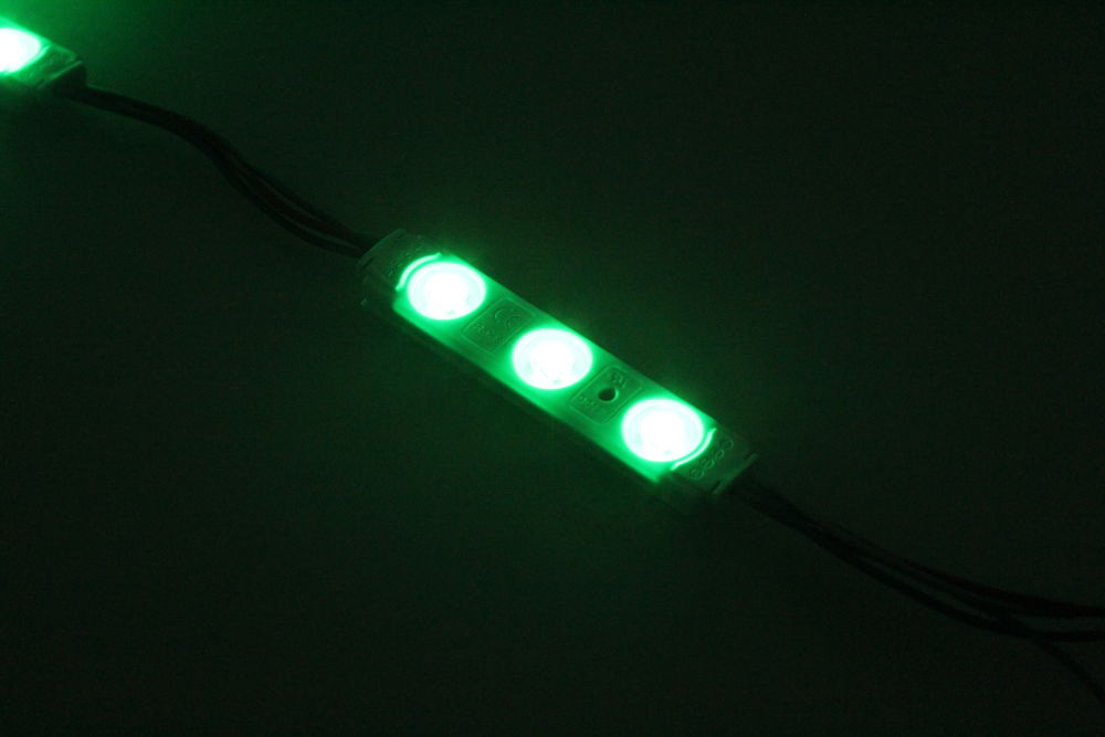 LM02 RGB IP65 - LED modul, pro osvětlení reklamy, LED 0,65W, RGB - červená, zelená, modrá, vyzař úhel 160°, 12V DC, IP65, rozměry 87x18x8mm, rozteč modulů 172mm, délka vodičů mezi moduly 85mm, max 20 modulů za sebou