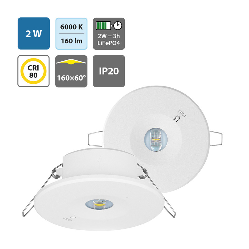 Vestavné podhledové nouzové svítidlo, plast černá, charakteristika OPEN AREA nebo CORRIDOR, SE - pouze nouzové svícení, LED 2W, 160lm, denní 6000K, záloha 3h, 230V, zvýšené krytí IP54, tř.2, d=98mm, h=43mm.