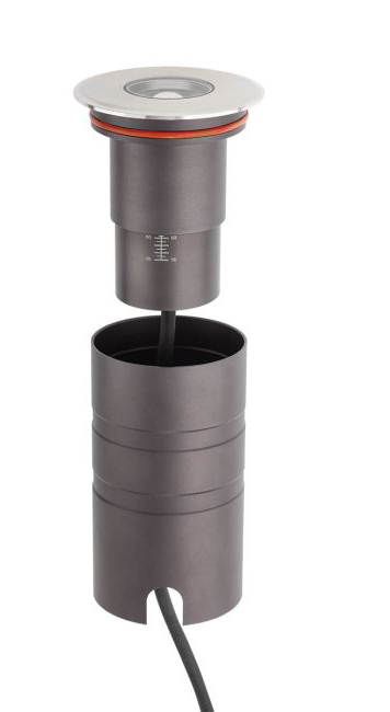 Zemní svítidlo, těleso hliník, rámeček nerez, sklo čiré, LED 18W, teplá 3000K/676lm, neutrální 4000K/720lm, nastav. ZOOM vyzař. úhel 15°-50°, UGR<10, 230V, IP67, d=70mm, h=125mm, vč. mont. boxu