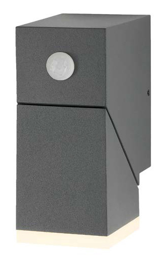 MURIL I 12,5W, IP54, PIR - Nástěnné venkovní svítidlo, PIR senzor pohybu, záběr 100°, dosah 2-7m, těleso hliník, černá antracit, dif plast opál, LED 12,5W, teplá 3000K, 750lm, 230V, IP54, tř.1, 103x65x145mm, svítí nahoru.