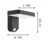 Nástěnné venkovní svítidlo, nast. svícení, senzor PIR, záběr 90°, 8m, čas 40s-7min, těleso plast, černá, dif. plast opál, LED 4,5W, 200lm, teplá 3000K, Ra80, nap. solar panel, výdrž 6h, IP44, tř.3, 130x120x180mm, svítí dolů
