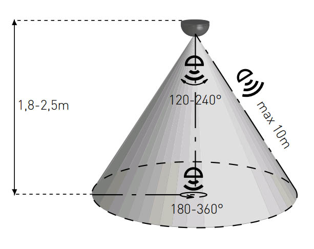 | Oblast záchytu lze vymezit přiloženými krycími clonami. PIR senzor s rozsahem 360/120°, dosah až 10m, Nastavení aktivace při soumraku | 2-2000lx, doba sepnutí 10s-15minut. |