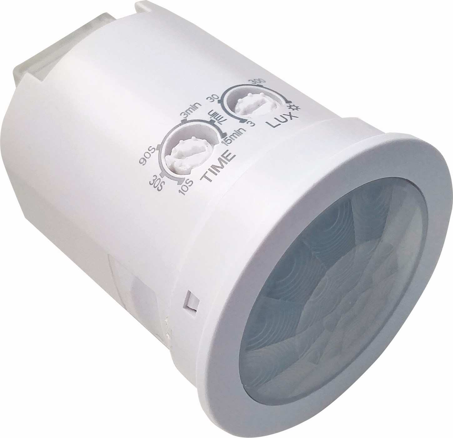 PIR 360°/120° 800W, IP20 - VÝPRODEJ Stropní vestavný senzor pohybu pro osvětlení, bílý, PIR, úhel záběru 360°/120°, dosah až 8m, 10s-15min, 3-2000lx, max.800W, 230V, IP20, d=50mm, h=65mm, pro os
