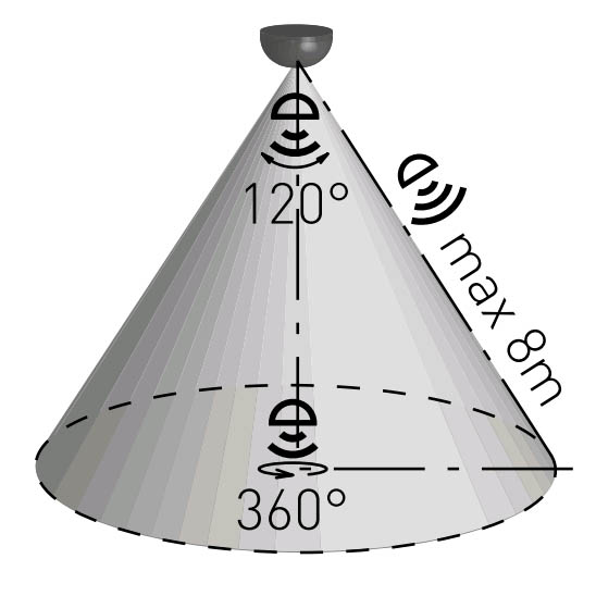 | Oblast záchytu lze vymezit přiloženými krycími clonami. PIR senzor s rozsahem 360/120°, dosah až 10m, Nastavení aktivace při soumraku | 2-2000lx, doba sepnutí 10s-15minut. |