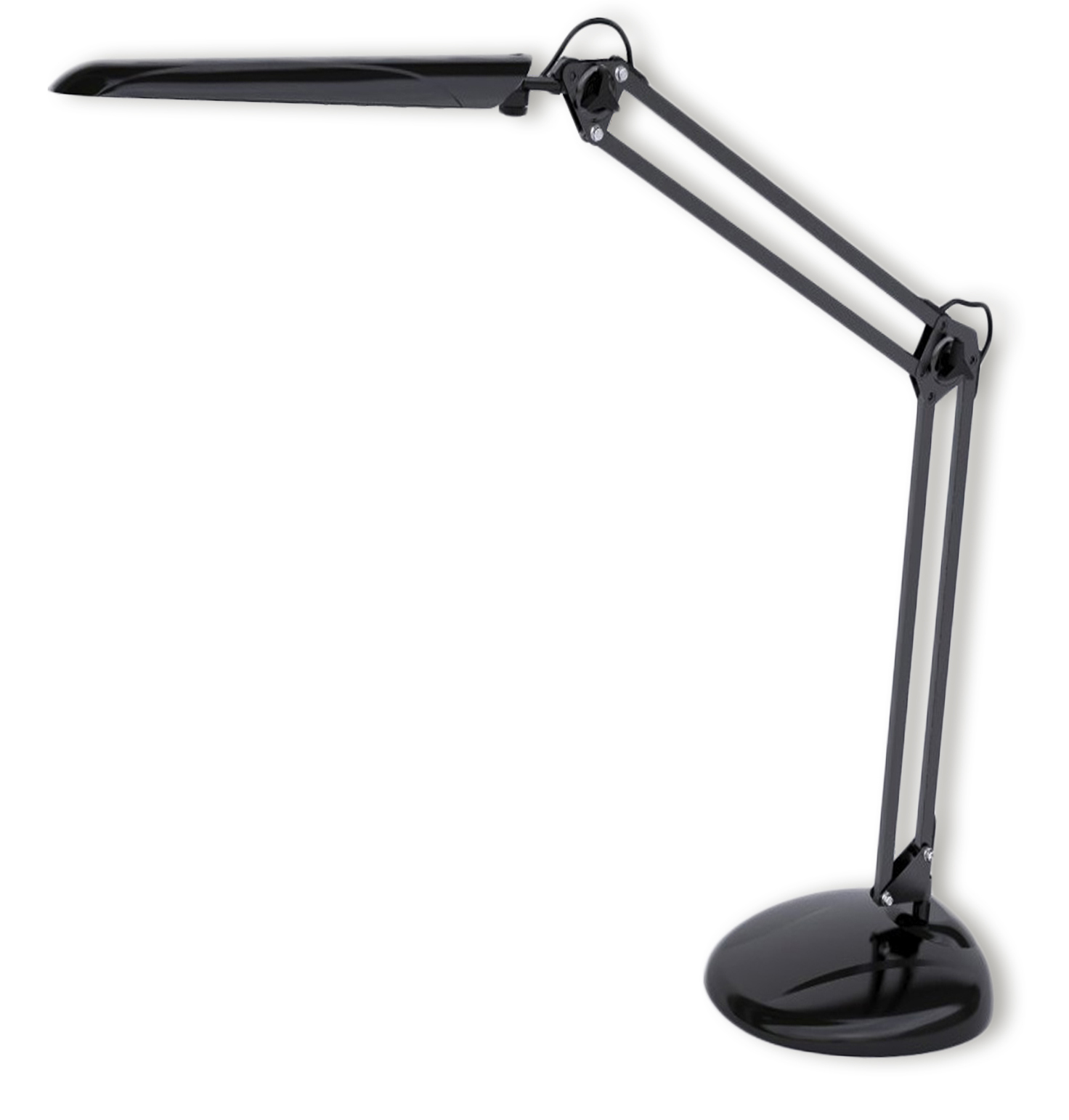 Stolní kancelářská lampa, 2 ramena, nastav směr svícení, těleso kov a plast, povrch bílá, nebo černá, LED 9W, 720lm, neutrální 4500K, stmívatelná, 230V, IP20, tř.1, rozměry h=700mm.