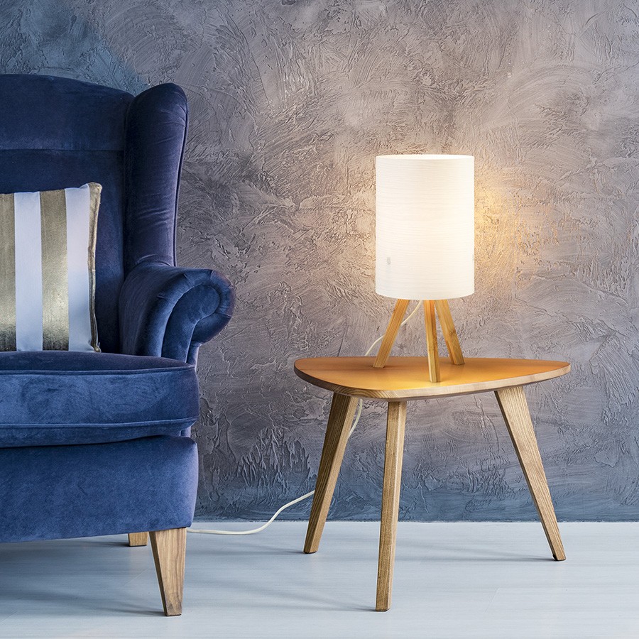 PENTO STOLNÍ TROJNOŽKA - VÝPRODEJ Stolní lampa, trojnožka, základna dřevo, povrch přírodní, stínítko plast bílá, pro žárovku 1x11W, E14, 230V, IP20, tř.1, rozměry d=160mm, h=357mm, vč vypínače na kabelu