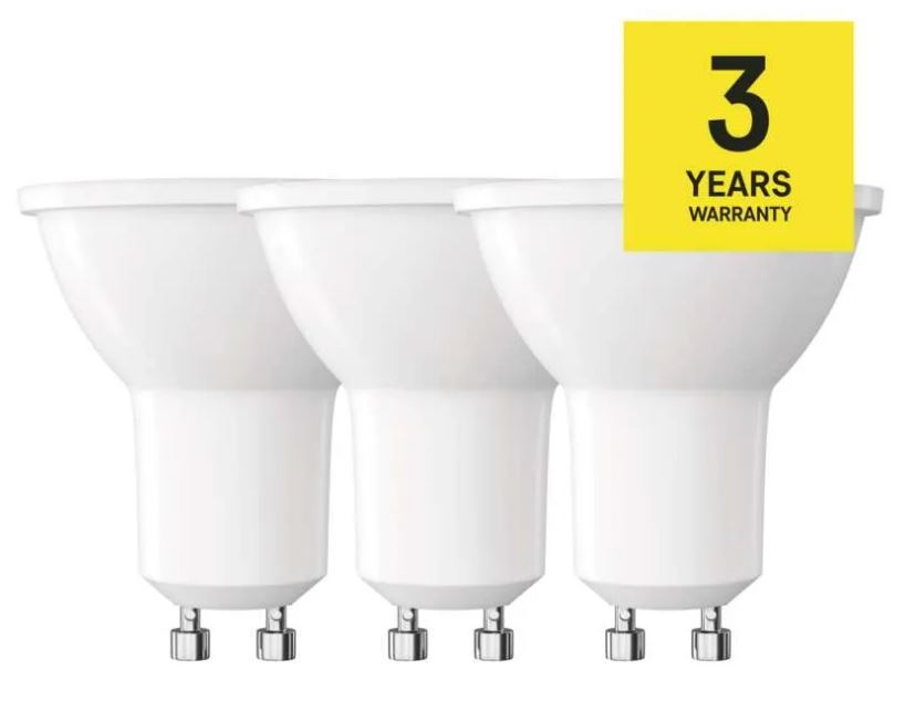 SADA 3ks - LED žárovka 7W, GU10 MR16, 100° d=50mm - světelný zdroj LED žárovka bodová, těleso plast bílá, dif plast čirý, LED 7W, GU10 MR16, 806lm, teplá 3000K, vyzař. úhel 100°, Ra80, 230V, rozměry d=50mm, h=58mm, životnost 30 000hod, 3ks v balení
