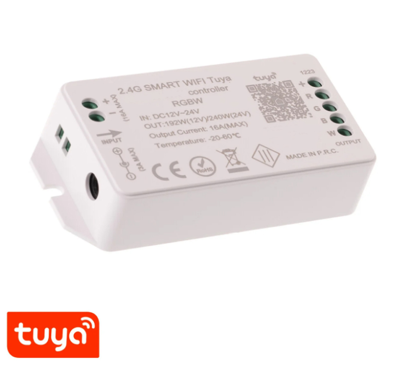 SMART WiFi Tuya driver RGBW 192W/240W - Kontroler přijímač pro ovládání LED pásků, ovládání telefonem smart systém Tuya, Wifi, 192W/12V, 240W/24V, RGBW, stmívání PWM, zap/vyp, IP20, rozměry 100x47x23mm.
