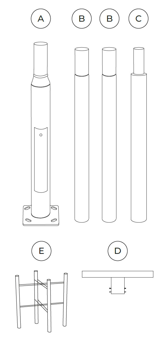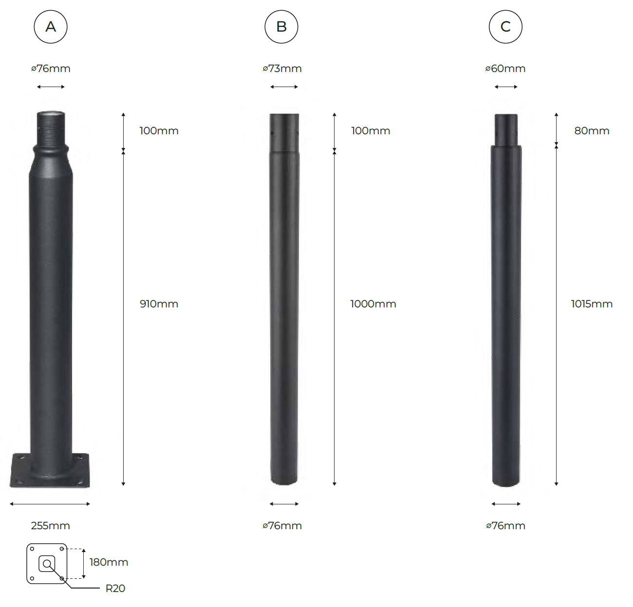| Sloup lze namontovat pomocí základové kotvy, umístit do země a zabetonovat, nebo na standardní betonový základ s roztečí šroubů 180 × 180 mm. Horní průměr 60 mm je vhodný pro většinu běžných svítidel, | |