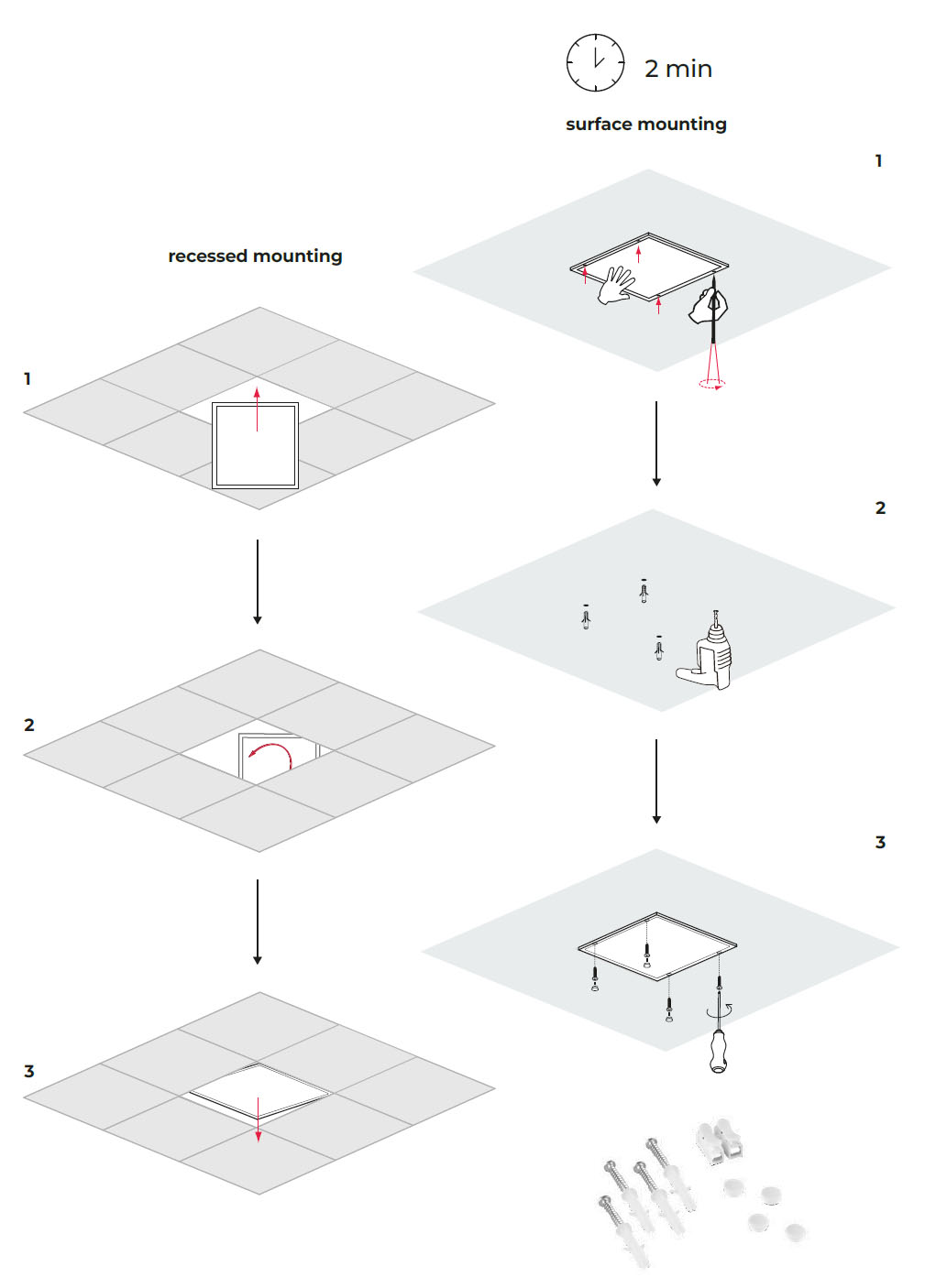 | Podmínka montážní polohy | Vestavné svítidlo stropní - určeno pro horní montáž do rastrového kazetového stropu. Lze doplnit rámem pro přisazenou instalaci, nebo zavěsit pomocí lankových závěsů |