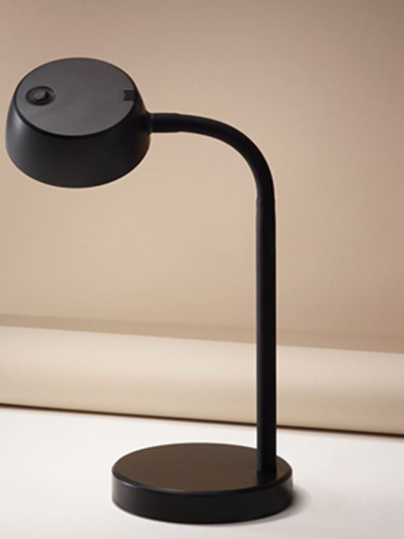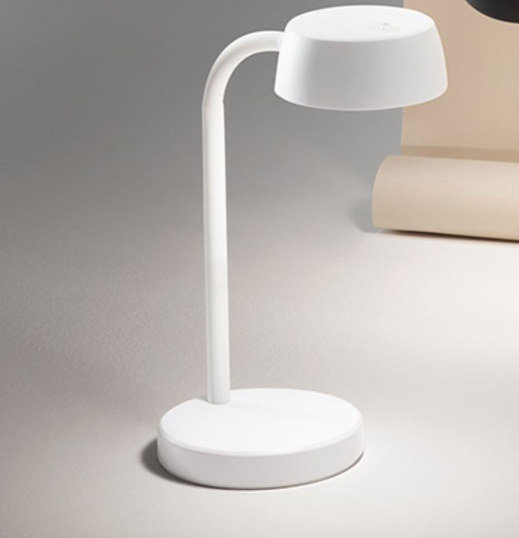 Stolní lampa, nastavitelný směr svícení, těleso plast, povrch bílá/černá, LED 5,5W, 500lm, teplá 3000K, 230V, IP20, rozměry 230x460mm.