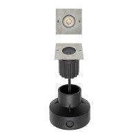 Zemní čtvercové svítidlo, základna hliník povrch černá, rám nerez, krycí sklo čiré, LED 3W, neutrální 4000K/teplá 3000K, vyzař. úhel 45°, 24V, IP67, IK06, Ra80, tř.3, rozměry 40x40x55mm, trafo samostatně, mont box SAMOSTATNĚ